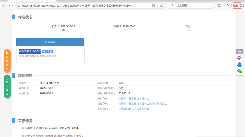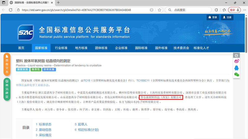 近日,智仑新材参与起草的国家标准GB/T 46317-2025《塑料 液体环氧树脂 结晶倾向的测定》正式发布,并将于2026年5月1日起实施。该标准由全国塑料标准化技术委员会(TC15)归口、全国塑料标准化技术委员会热固性塑料分会(TC15SC11)执行,这一标准的出台,为行业提供了科学统一的检测方法,将有力推动环氧树脂产业的质量升级与规范化发展。